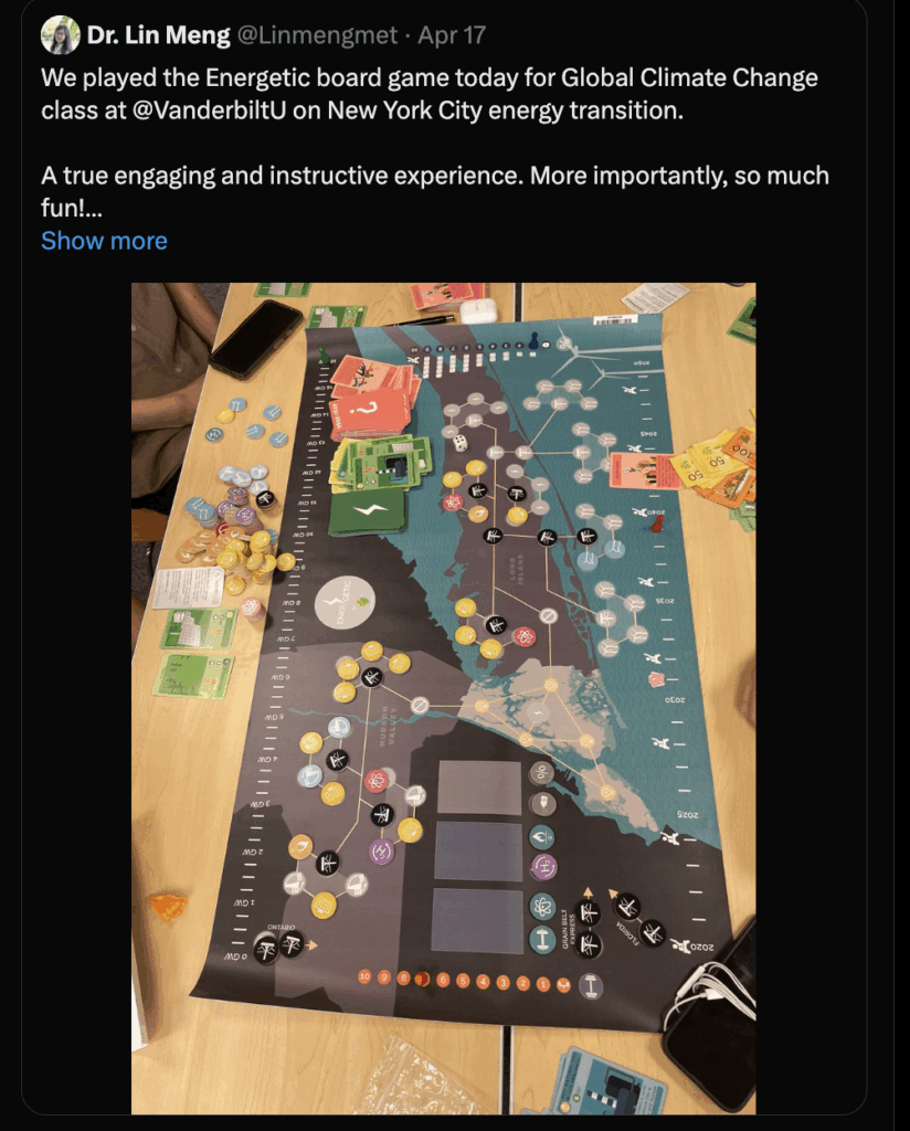 These are some of the reactions to Energetic, a board game that challenges players to overcome financial, political and engineering obstacles to build out New York’s renewable energy capacity by 2035. The game is part of classes at Harvard, Yale, Brown and Cornell as well as NYC high schools and middle schools. Teachers who attend will get a free game set (retails at $89). For more information email