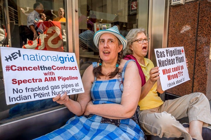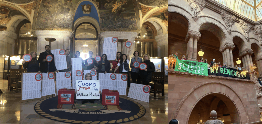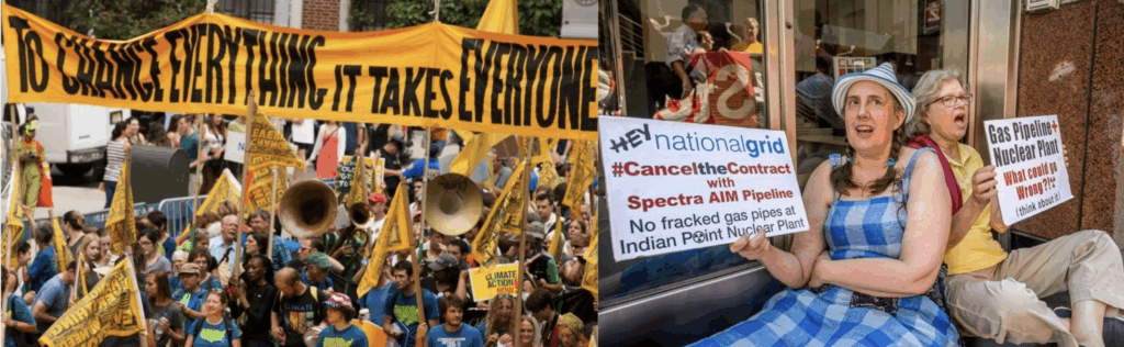 We entered 2016 ready to grow our impact. That year we became a formal member of NY Renews, standing shoulder to shoulder with a statewide coalition to push for bold climate legislation in Albany. We hosted “Don’t Fuel the Refugee Crisis,” connecting climate change to global displacement, and grew enough to form dedicated committees and a seven-person Steering Committee. We took action at National Grid’s Brooklyn office to protest the AIM pipeline near Indian Point and joined the push for offshore wind in Long Island Sound.