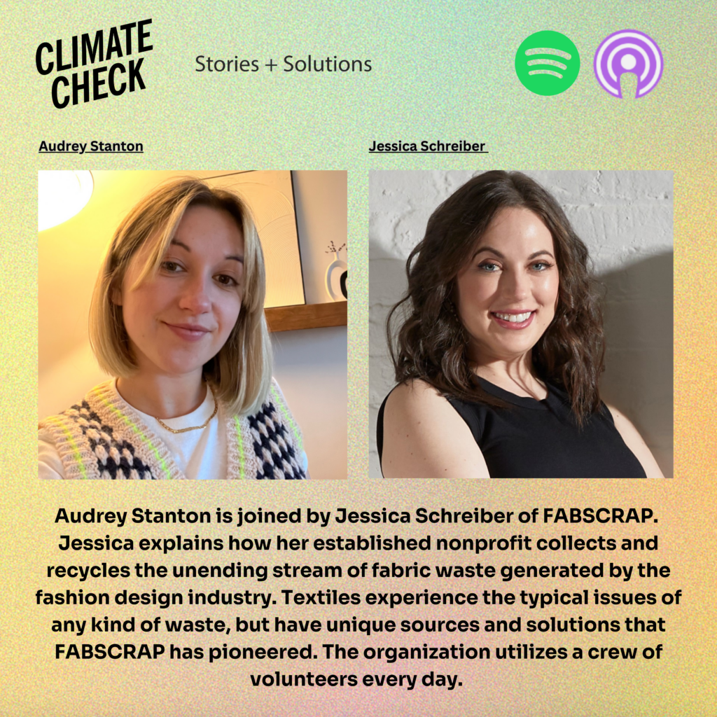 Audrey Stanton is joined by Jessica Schreiber of FABSCRAP. Jessica explains how her established nonprofit collects and recycles the unending stream of fabric waste generated by the fashion design industry. Textiles experience the typical issues of any kind of waste, but have unique sources and solutions that FABSCRAP has pioneered. The organization utilizes a crew […]