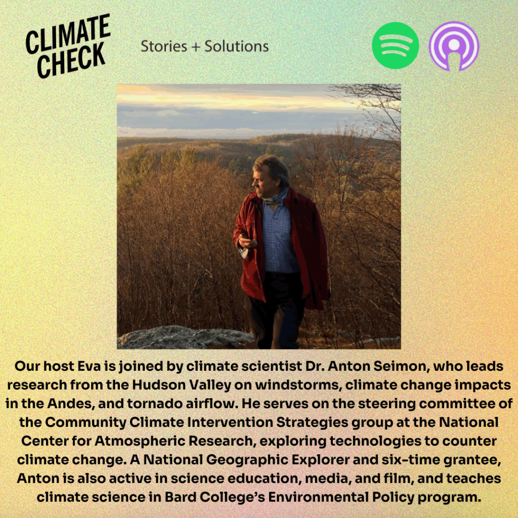 Our host Eva is joined by Dr. Anton Seimon, climate scientist. From a home base in the Hudson Valley, Anton leads research programs on diverse themes in the atmospheric and environmental sciences. Current projects include classifying a new type of windstorm and developing warning systems for it, monitoring climate change impacts in alpine watersheds of […]